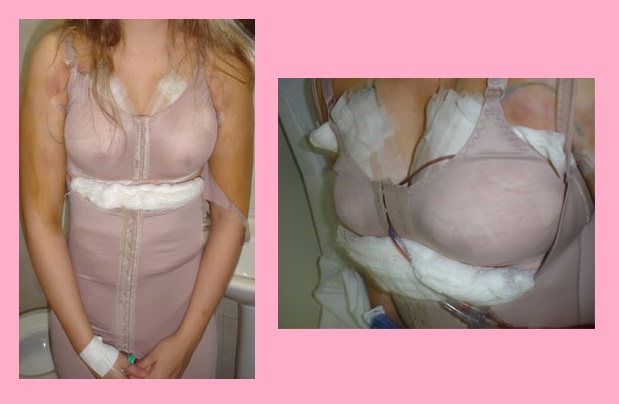 Pós-operatório…ainda no hospital repleta de gase, curativos, modeladores, dreno nos seios, muita inchada e com dor no corpo todo. Utilizei o dreno apenas enquanto fiquei internada(1 dia).