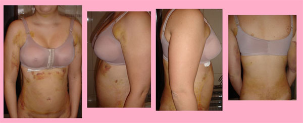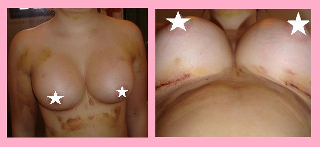 Primeira semana após a cirurgia…hematomas, inchaço e com os seios totalmente sem forma.