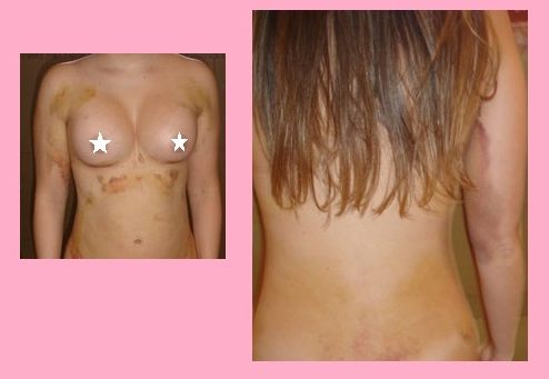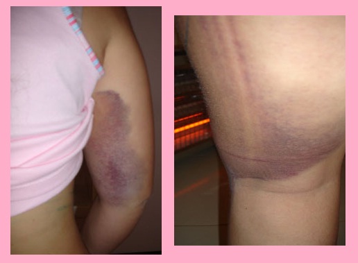 Minha pele muito sensível, ficou repleta de hematomas…utilizei creme e tomei a solução de arnica 2x/dia e os roxos sumiram em 12 dias. * Não fiz lipo no braço todo, pois meu médico não lipa o “famoso tchau” devido a flacidez que pode surgir depois…a única coisa que ele fez foi retirar o mínimo na parte interna no braço…no triceps que é o grande acúmulo de gordura não foi mexido!