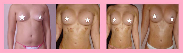 Seios inchados e ainda sem forma…após a cirurgia meu busto de 88 cm aumentou para 93 cm, porém hoje reduziu para 91 cm. Minhas cicatrizes foram tratadas com o uso das pomadas Cetrilan e Contractubex 3x/dia e fita de silicone O’ gel.