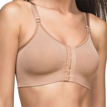 Existem vários modelos de sutiã pós-cirúrgico, porém os mais recomendados são os com abertura frontal, para melhor facilidade no momento de vestir, evitando esforços que poderão comprometer a recuperação pós-cirúrgica, reforço em baixo do busto e alças reguláveis, conforme figura abaixo: