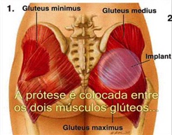 Qual o local onde a prótese é implantada?Dentro do maior músculo da região, chamado músculo maior. A prótese é colocada no meio do músculo, mantendo assim a mesma quantidade de músculo atrás e na frente, camuflando a presença de uma prótese.