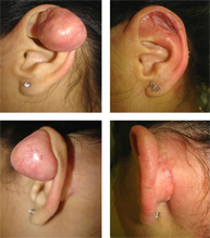 Exemplo de Tratamento de quelóide com retirada completa na parte de cima da orelha provocado por piercing. A esquerda presença do quelóide. À direita, pós-operatório de 1 mês, utilizando enxerto de pele retirada de trás da mesma orelha para cobertura da área.